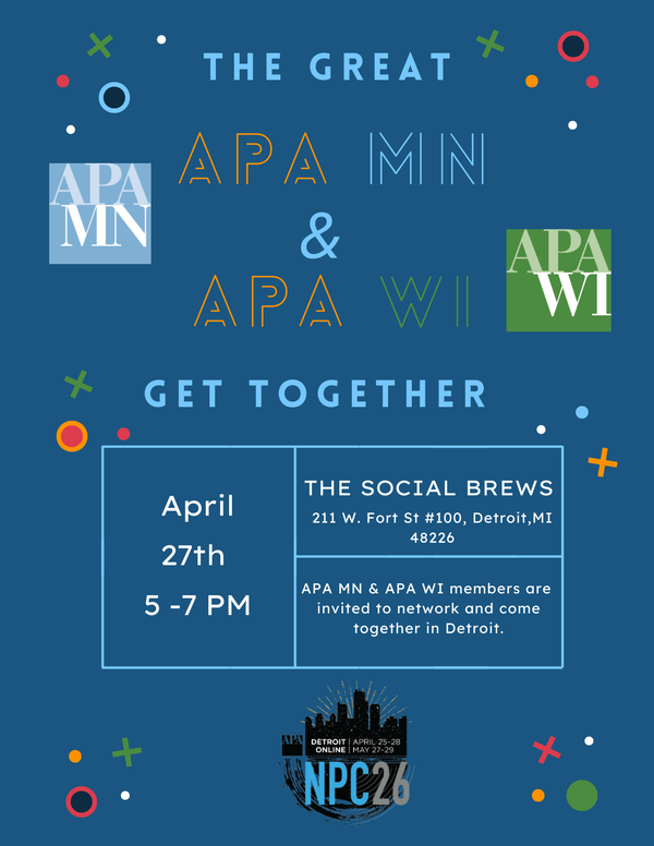 Join the APA MN and APA WI chapters for a casual happy hour on Monday, April 27th in Detroit. Come enjoy one of Detroit's local establishments and meet new friends!